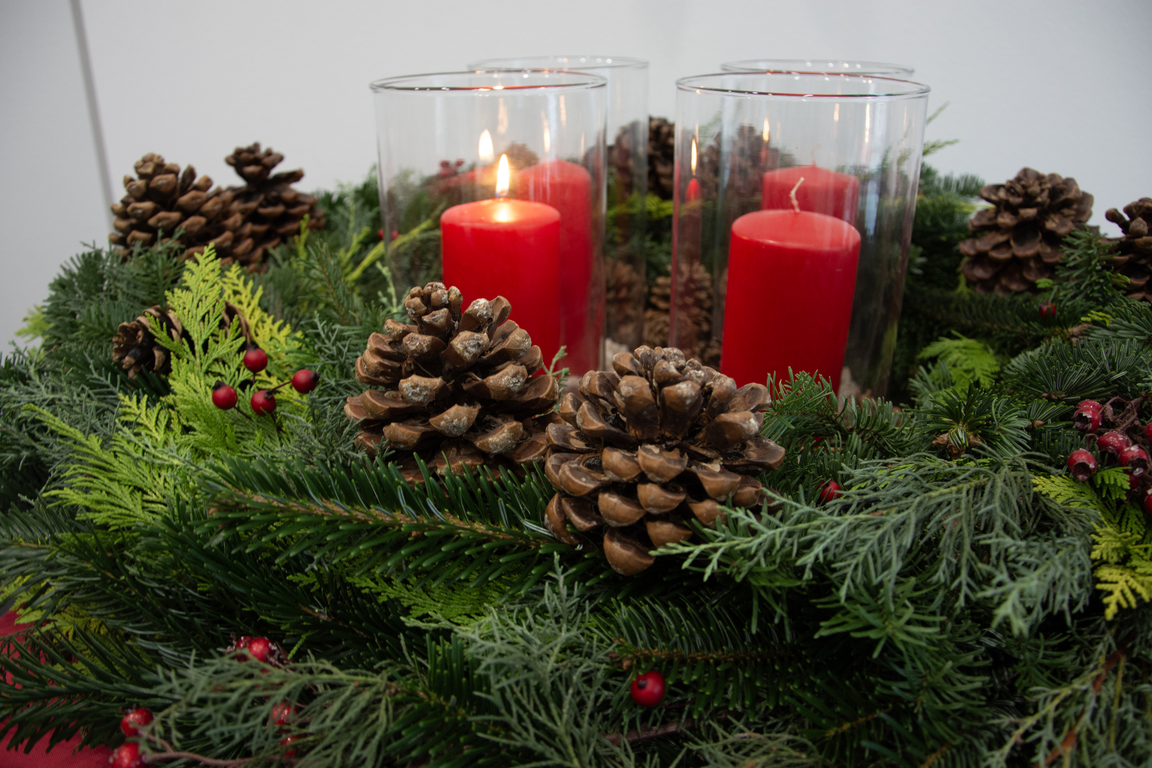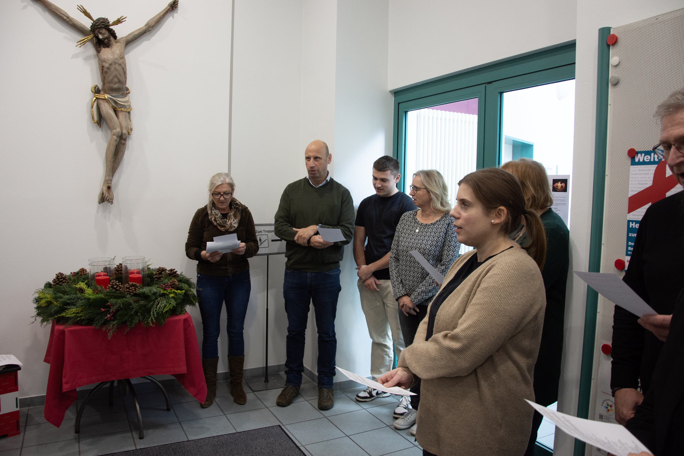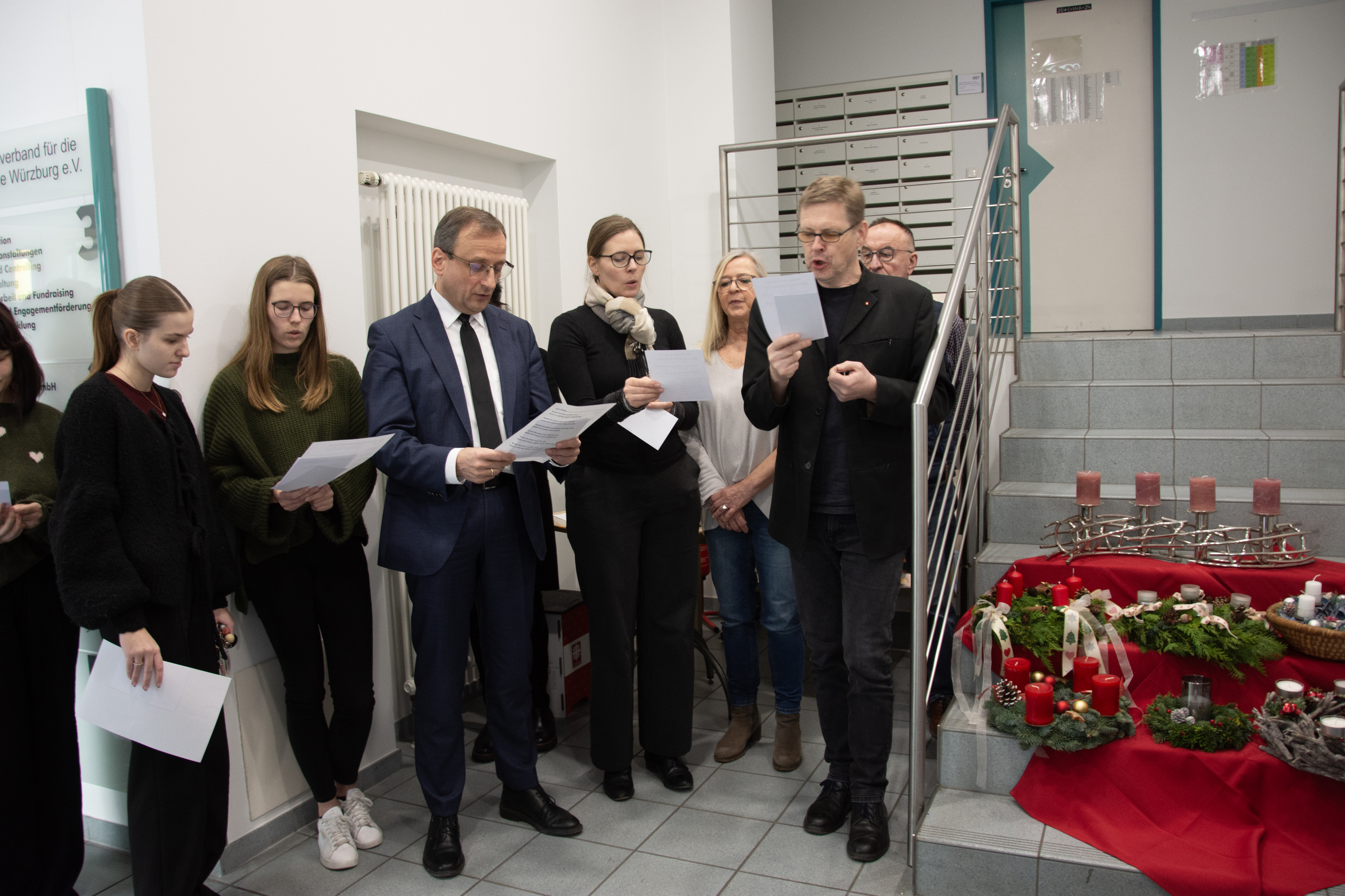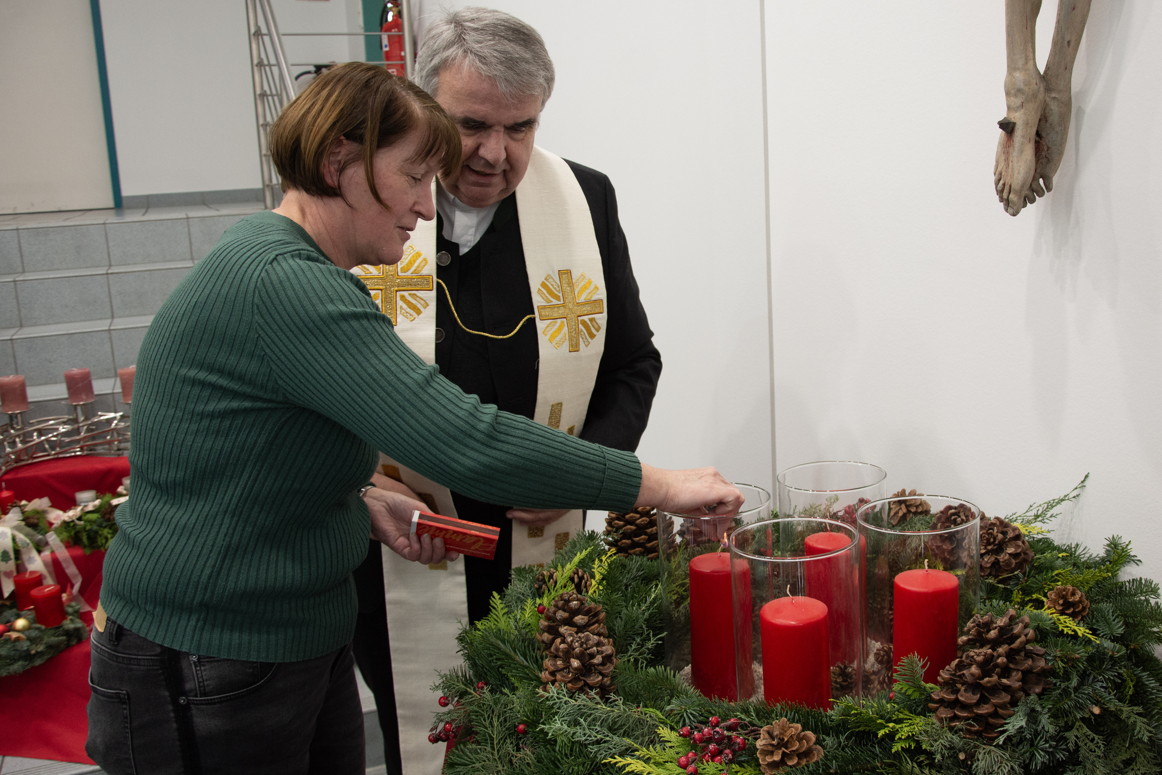 Einige Mitarbeitende hatten ihren Adventskranz oder ihr Adventsgesteck mitgebracht. Auch der große Adventskranz des Caritashauses, dessen Kerzen in den nächsten Wochen nach und nach entzündet werden und deren Schein den Eingangsbereich der Geschäftsstelle erhellt, wurde aufgestellt. Nachdem Domkapitular Clemens Bieber alle Kränze und Gestecke gesegnet hatte, entzündete Mitarbeiterin Doris Kühnlein stellvertretend die erste Kerze am Adventskranz.