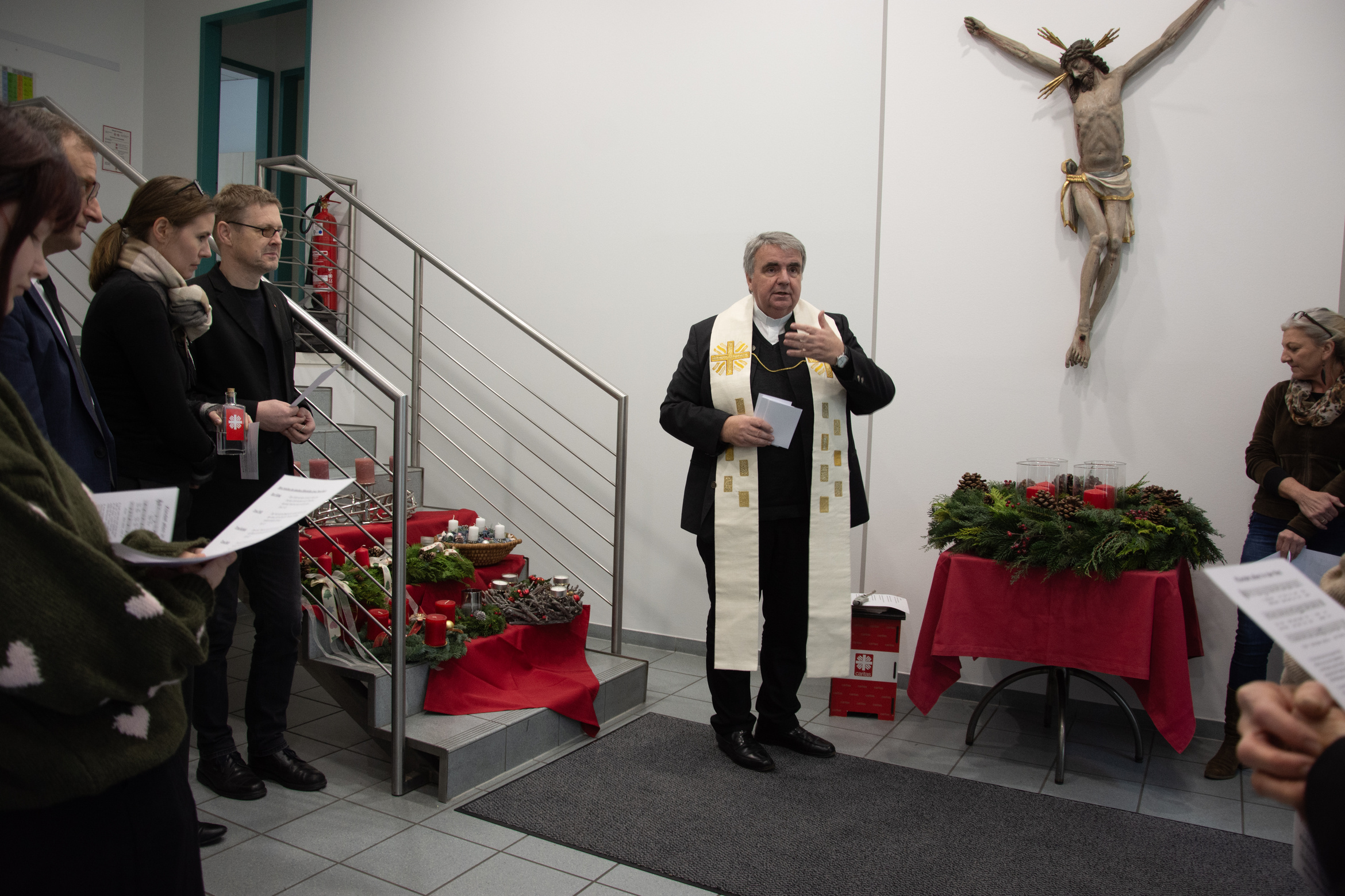 Zur Andacht mit Liedern, Texten und Gebeten versammelten sich die Mitarbeiterinnen und Mitarbeiter zur Mittagszeit im Foyer des Caritashauses in der Franziskanergasse. Die kurze Segnungsfeier stellte Domkapitular Clemens Bieber unter das Leitmotiv „In Erwartung“. Dazu interpretierte er unter anderem den Holzschnitt „In Erwartung“ von Walter Habdank. Außerdem trugen DiCV-Mitarbeitende Verse aus der Bibel vor, die das Thema in den Fokus rücken.